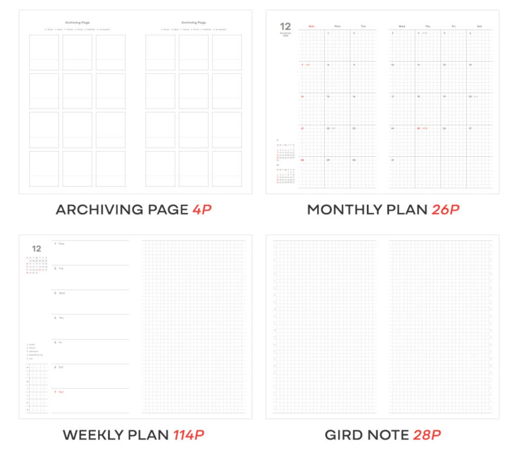 - Układ treści: Intro (1 str.), Kalendarz (2 str.), Plan roczny (2 str.), Rutyna miesięczna (26 str.), Plan miesięczny (26 str.), Plan tygodniowy (114 str.), Notatki w kratkę i linie (40 str.), Archiwizacja (4 str.), Dane osobowe (1 str.).
