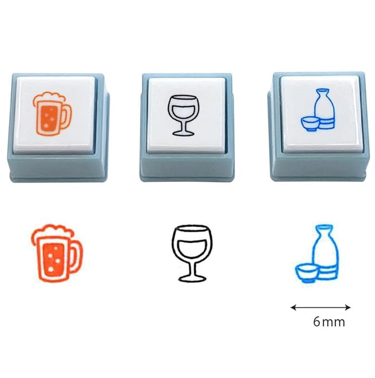 Zestaw trzech samotuszujących pieczątek z motywami napojów, idealnych do dekoracji dzienników, planerów i kreatywnych projektów. Wzory obejmują ikonkę kufla piwa, kieliszka do wina oraz karafki do sake.
