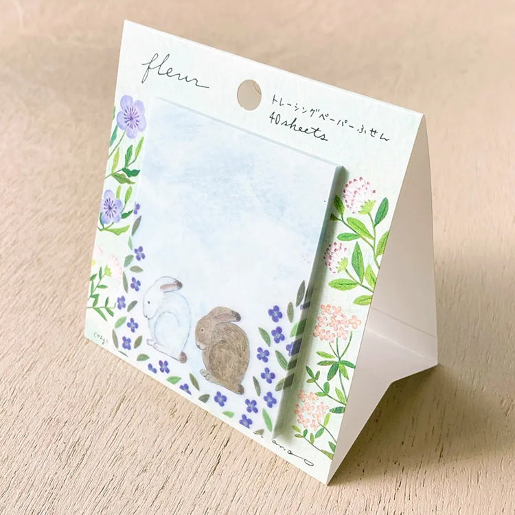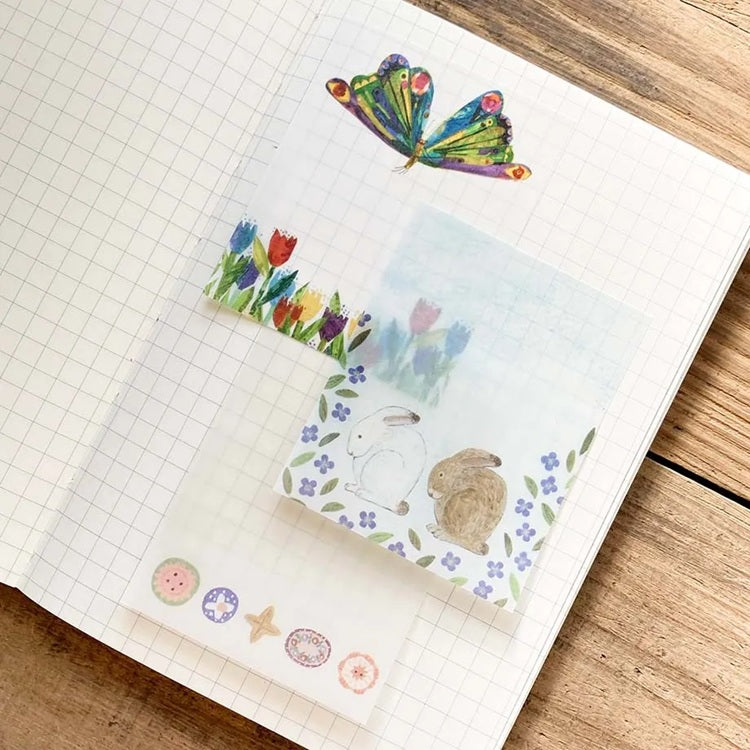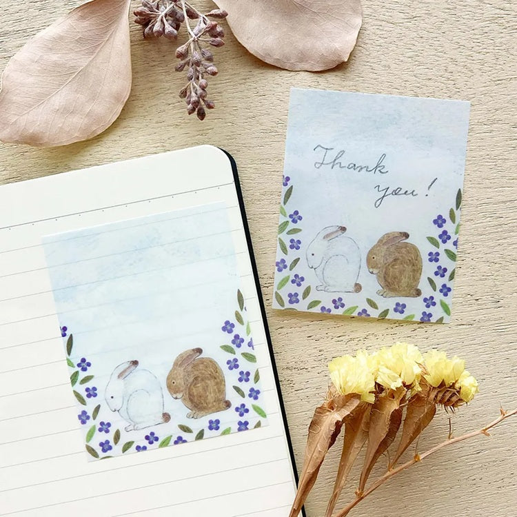 Urocze karteczki samoprzylepne z kolekcji Midori Asano, które zachwycają delikatnym, kwiatowym motywem. Ilustracje przedstawiają dwa króliki otoczone fioletowymi i różowymi kwiatami, tworząc subtelny, naturalny klimat. Karteczki wykonane z półprzezroczystego papieru typu "tracing paper" idealnie nadają się do notatek, journalingu czy dekoracji.