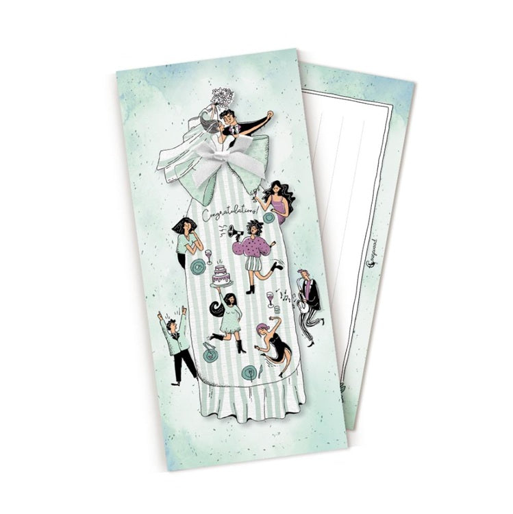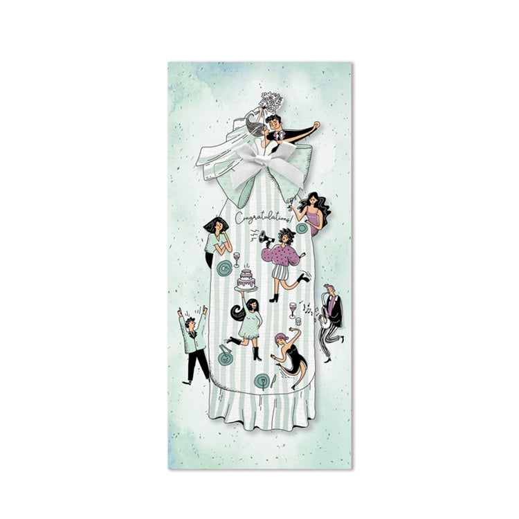 Elegancka kartka z trójwymiarowym elementem, przedstawiającym radosną scenę weselnego przyjęcia! Centralnym motywem jest długa suknia panny młodej oraz młoda para. Wokół widoczni są goście w dynamicznych pozach – tańczący, wznoszący toasty i niosący tort weselny. Idealna, by uczcić wyjątkowe chwile ślubu i wesela!