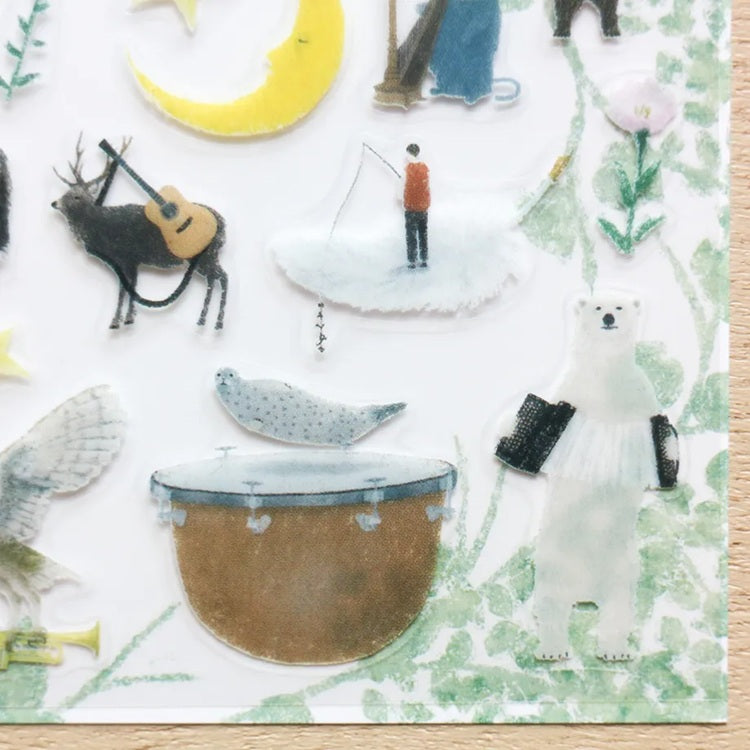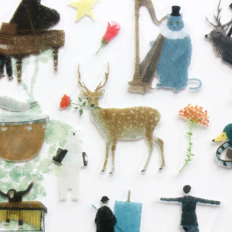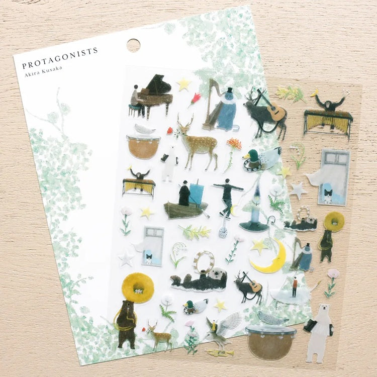 Naklejki z kolekcji "PROTAGONISTS" autorstwa Akiry Kusaki przedstawiają różnorodne, bajkowe ilustracje. Całość utrzymana jest w delikatnym, ilustracyjnym stylu, tworząc magiczny świat pełen muzyki, przyrody i fantazji,