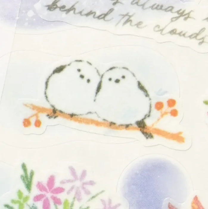 Zestaw naklejek przedstawiających delikatne ilustracje sikorek długoogonowych, roślin i scen nocnych.