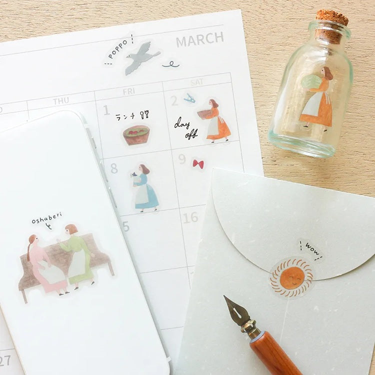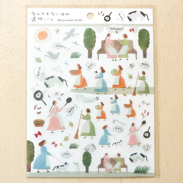 Naklejki przedstawiają urocze sceny z codziennego życia, takie jak zajmowanie się gotowaniem, sprzątaniem czy rozmowami na ławce. Ilustracje są delikatne i stylizowane, a towarzyszą im elementy natury, jak drzewa, słońce i ptaki, oraz drobne detale, takie jak kosze, miotły czy patelnie, co tworzy spokojny i sielankowy klimat.