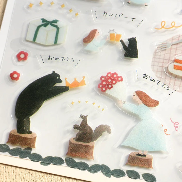 Naklejki przedstawiają uroczy motyw urodzinowy z postaciami dziewczynek, misiów i wiewiórek, które biorą udział w celebracji – wręczają prezenty, wznoszą toasty, trzymają balony i rozsypują konfetti.