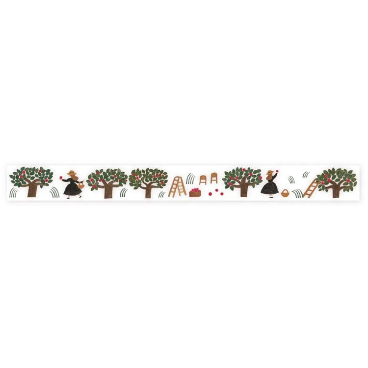 Przezroczysta taśma przedstawiająca uroczy motyw zbioru jabłek.