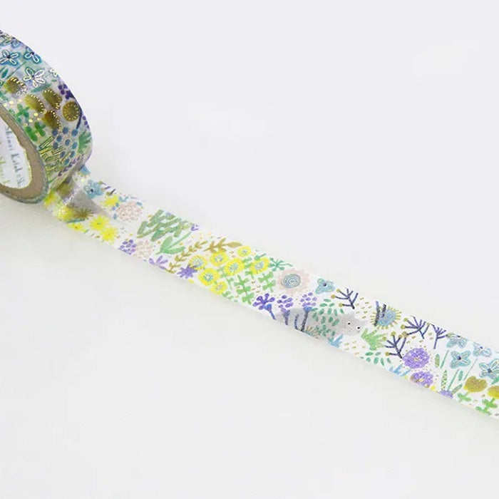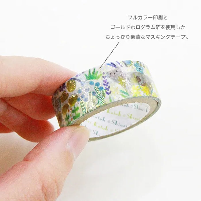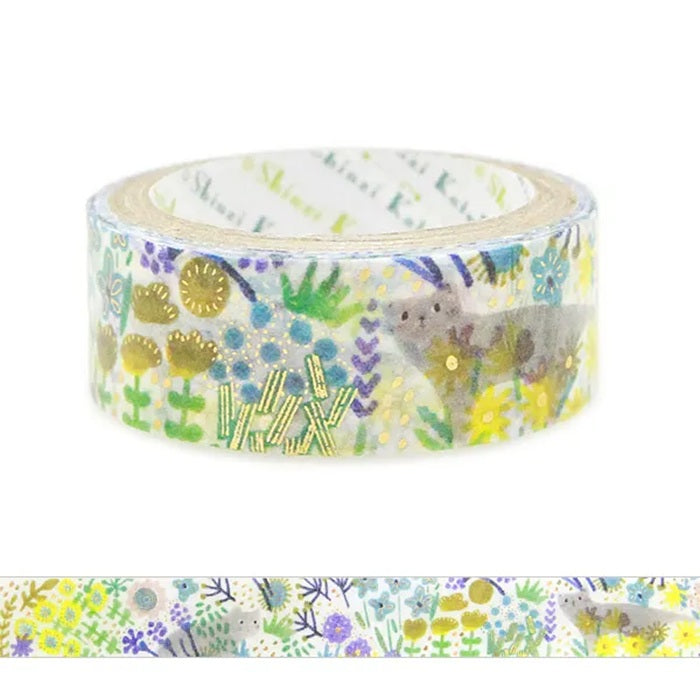 Dekoracyjna taśma washi ze złotymi elementami z motywem kota w ogrodzie pełnym kwiatów.