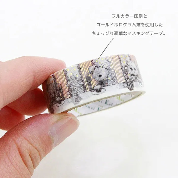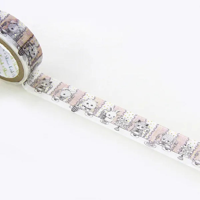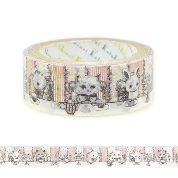 Urocza taśma dekoracyjna washi ze złotymi elementami przedstawiająca kotki i króliczki podczas popołudniowej herbatki.
