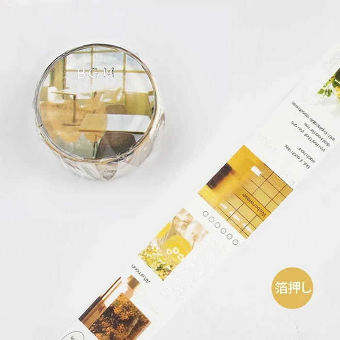 Dekoracyjna taśma washi z ciepłymi, żółto-złotymi tonami, ozdobiona różnorodnymi wzorami i tekstami.