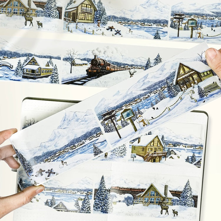 Taśma washi Pre-Cut | Zimowy świat to ręcznie malowane, zimowe krajobrazy. Drzewa, góry, chatki czy pociąg pędzący w śniegu przyozdobią twój kalendarz czy bullet journal ale doskonale sprawdzą się również w innych kreatywnych projektach.