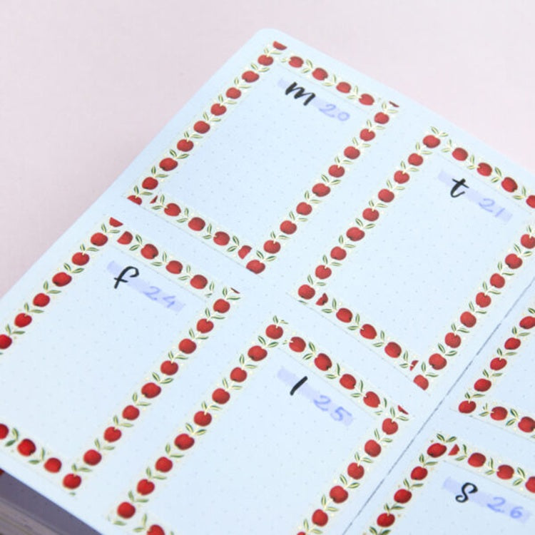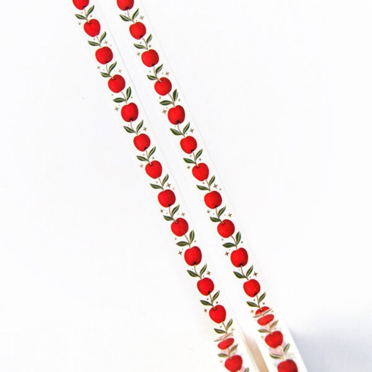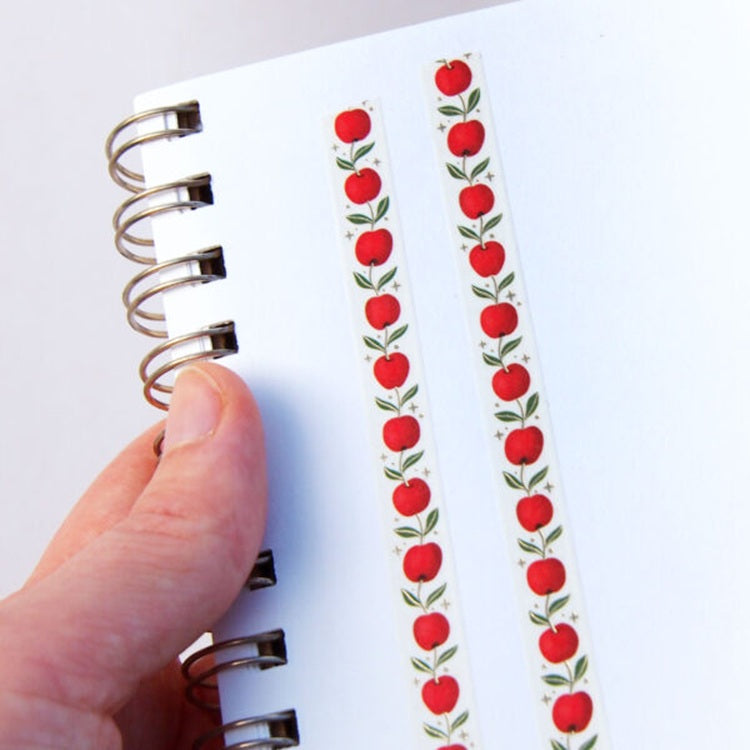 Urocza taśma washi ozdobiona wzorem czerwonych jabłek połączonych delikatnymi zielonymi gałązkami z listkami. Drobne złote akcenty w postaci gwiazdek dodają całości subtelnego, magicznego charakteru, idealnego do kreatywnych projektów, journalingu czy dekoracji.