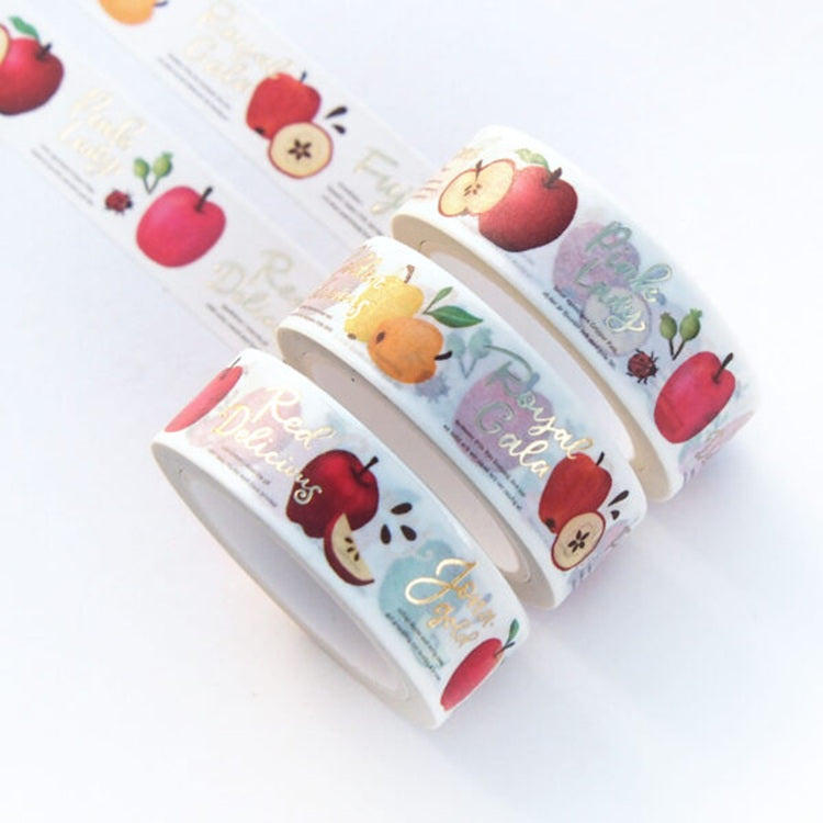 Taśma washi przedstawiająca różne odmiany jabłek wraz z ich nazwami. Ilustracje realistycznych jabłek, zarówno w całości, jak i przekrojonych, uzupełniają drobne detale, takie jak liście i kwiaty, tworząc naturalny i uroczy wzór.