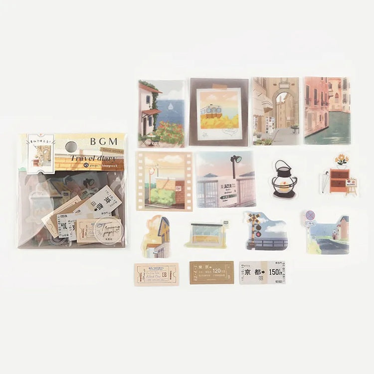 Zestaw naklejek zawierający ilustracje malowniczych krajobrazów i miejskich scenerii, takich jak wąskie europejskie uliczki, kanały z kolorowymi budynkami oraz widoki na morze z czerwonymi dachami w tle. Całość utrzymana jest w ciepłych, pastelowych barwach, idealnych do journalingu, scrapbookingu i kreatywnych projektów.