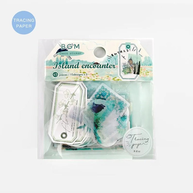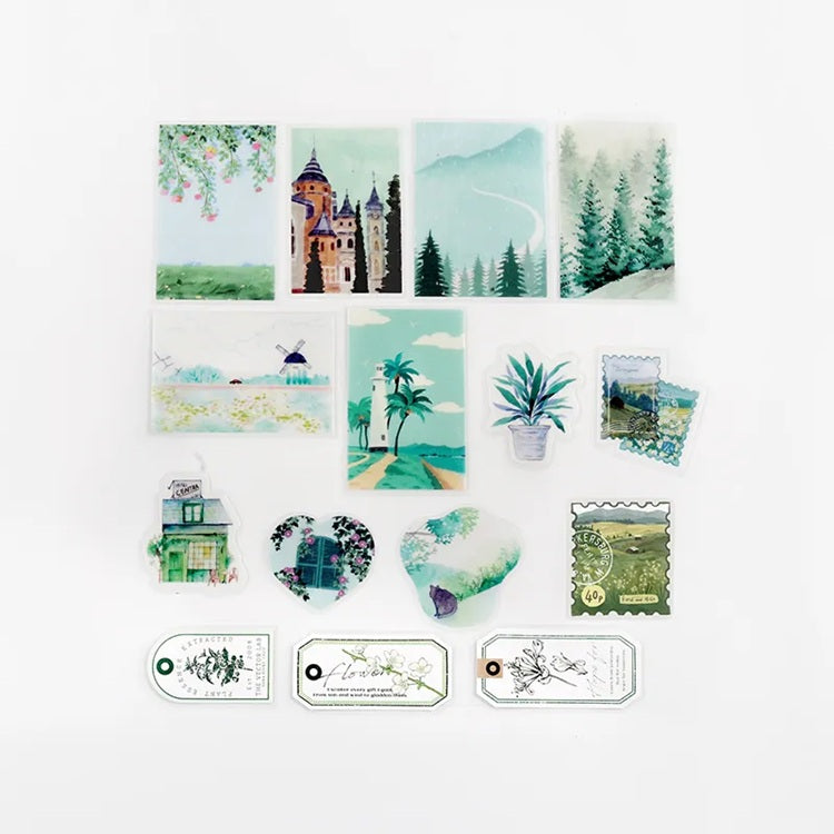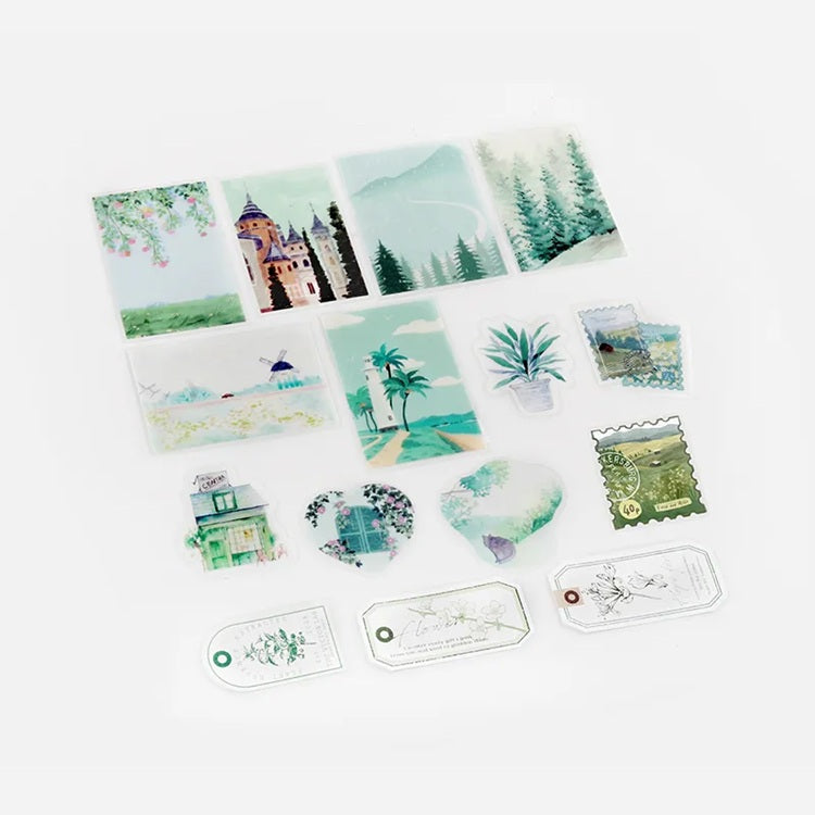 Zestaw naklejek Spotkanie na wyspie | Zielony to kolekcja inspirowana naturą, spokojnymi krajobrazami i delikatnymi botanicznymi motywami. Naklejki w akwarelowym stylu przedstawiają malownicze pejzaże, rośliny oraz urocze detale, które idealnie nadają się do scrapbookingu, journalingu czy dekoracji plannerów.
